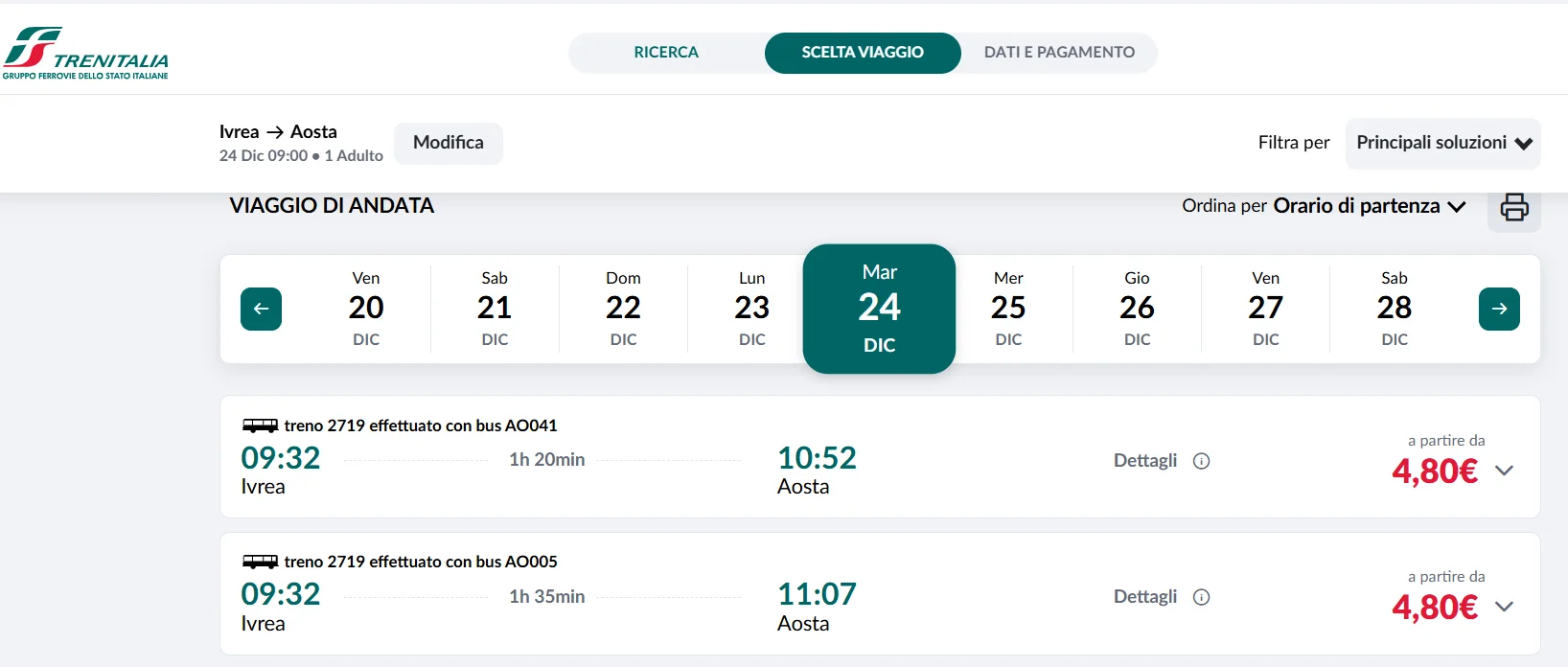 Até o dia 5 de janeiro de 2024, a Trenitalia oferece conexões extraordinárias entre Aosta e Ivrea:- Sábados: Seis ônibus adicionais circularão pela rota Aosta-Ivrea, utilizando a autoestrada para uma viagem rápida e confortável.