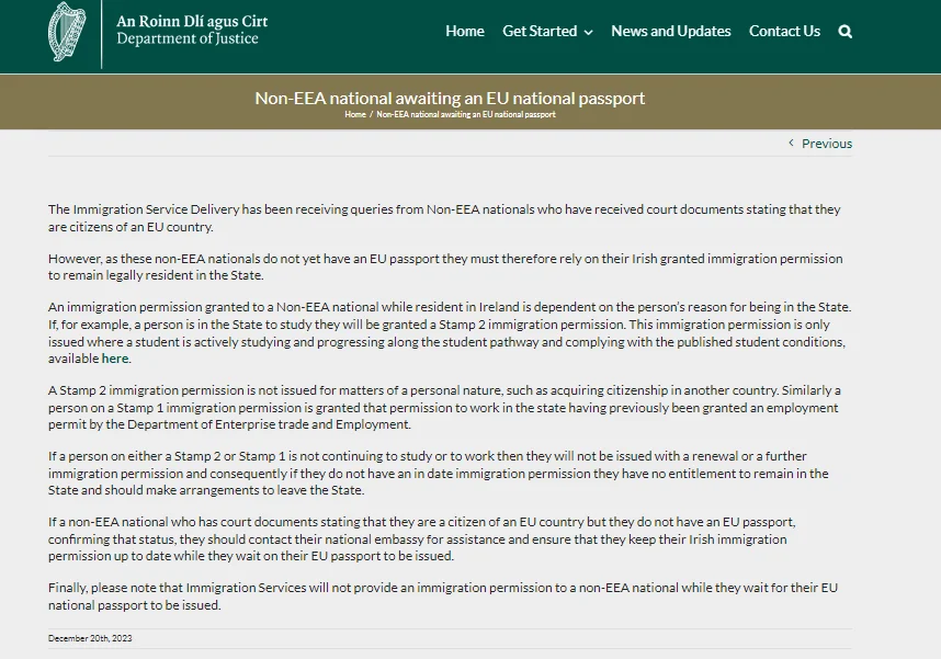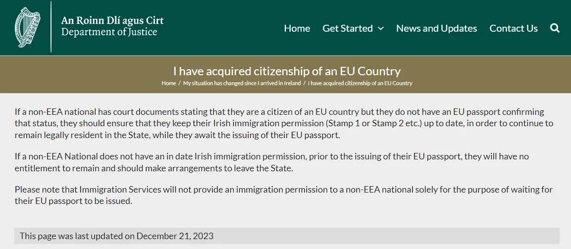 No dia 20 de dezembro de 2023, uma atualização oficial foi lançada pela Irish Immigration Service (Serviço de Imigração Irlandês), este comunicado esclarece os novos procedimentos destinados aos cidadãos não pertencentes ao Espaço Econômico Europeu (EEE) que adquiriram cidadania de um país da União Europeia (UE) e aguardam a emissão do respectivo passaporte da UE na Irlanda.