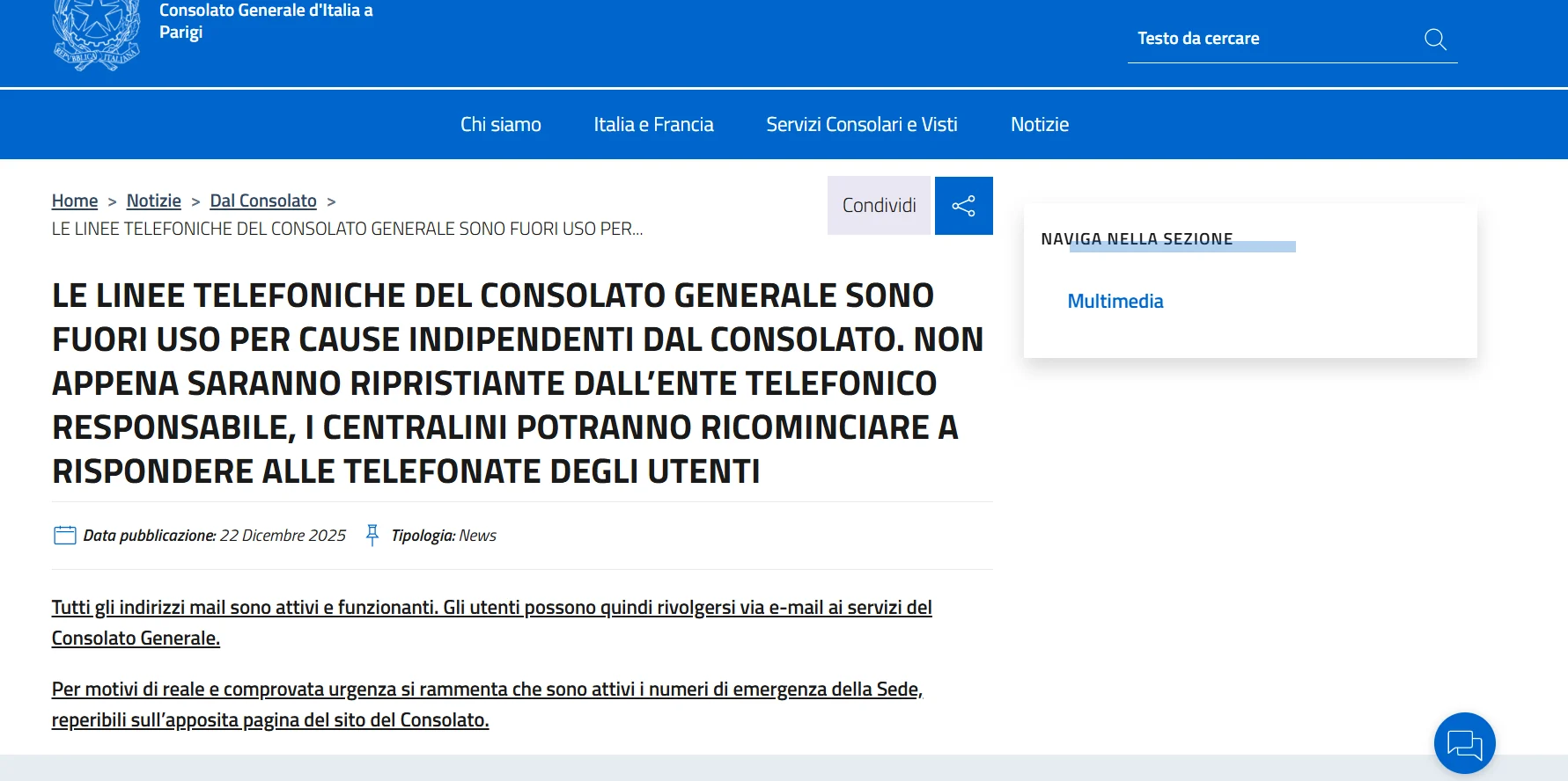 Consulado Geral da Itália em Paris informa 22/12 instabilidade temporária nas linhas telefônicas