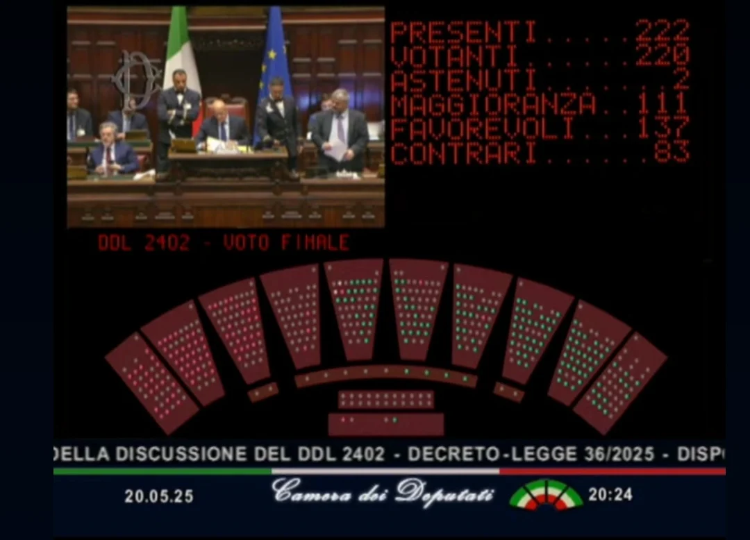 - O resultado final da votação sobre o Decreto-Lei 36/2025 (DDL 2402) na Câmara dos Deputados da Itália.