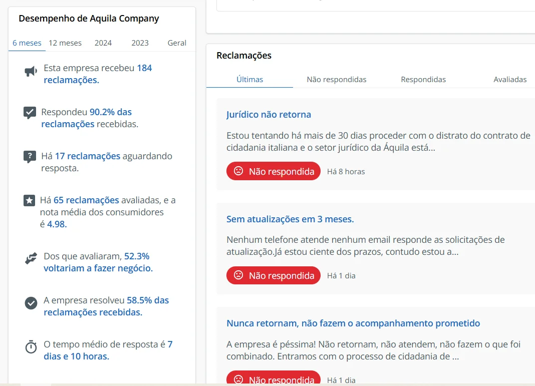 Clientes da Áquila Global Group relatam abandono, falta de comunicação e não cumprimento de reembolsos, gerando insegurança nos processos de cidadania italiana.