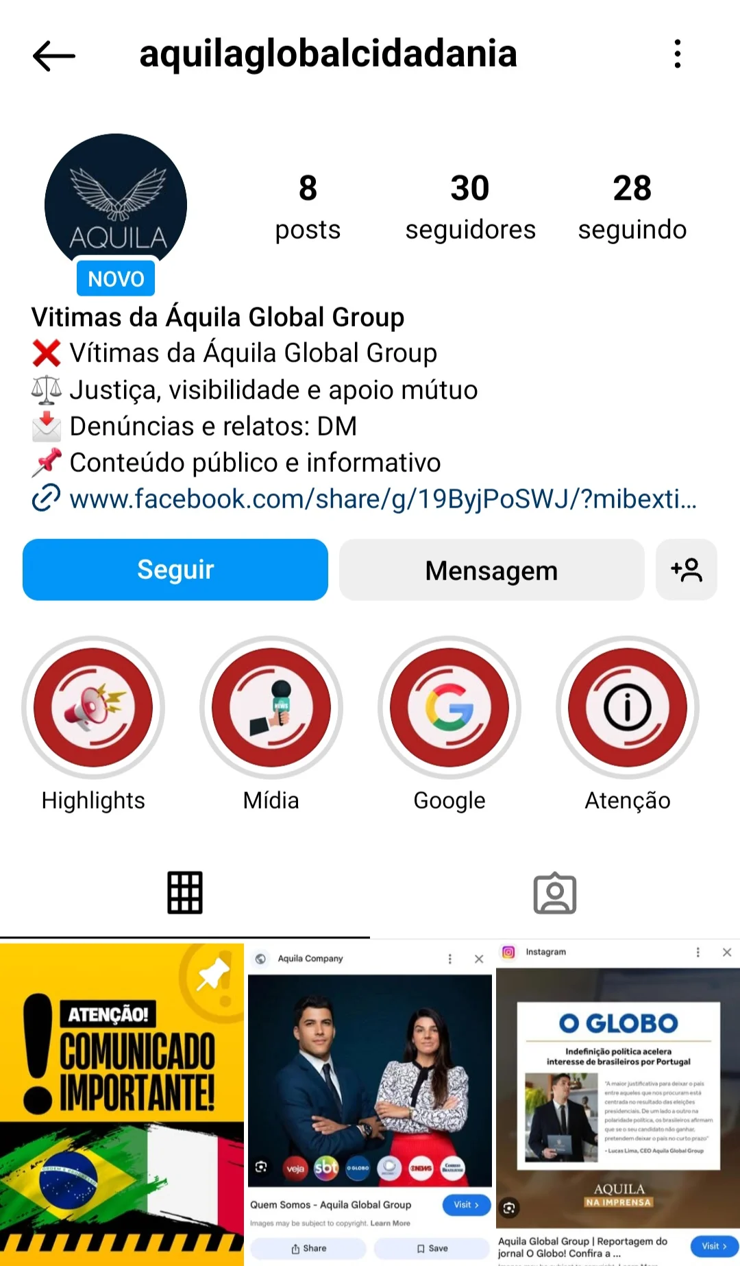 “Este perfil tem como único objetivo informar, dar visibilidade e acolher pessoas que se dizem prejudicadas pela empresa Áquila Global Group.
