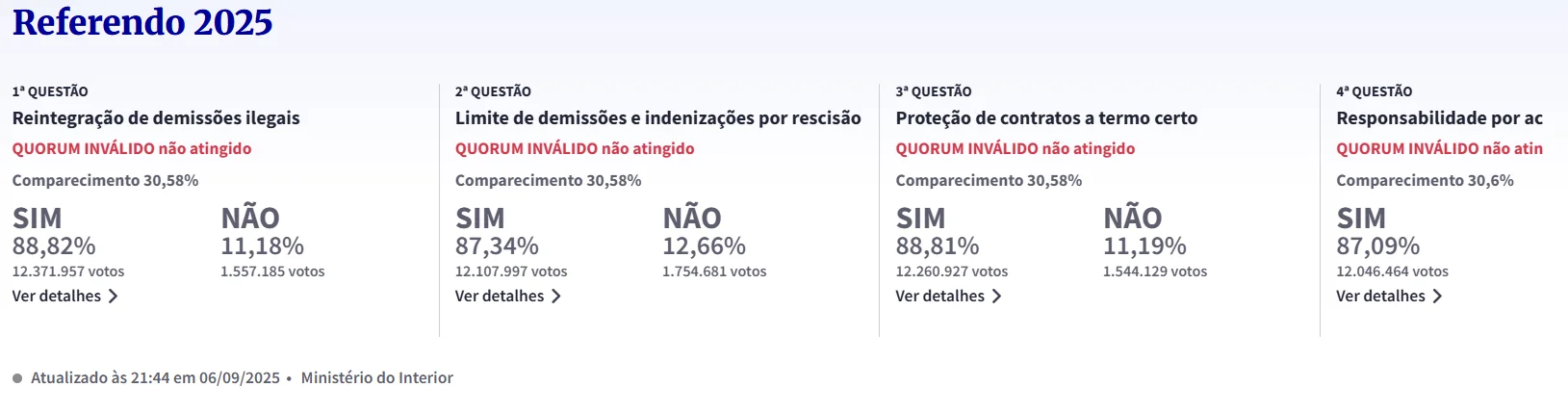 Apesar da ampla maioria de votos favoráveis em todas as quatro questões do Referendo 2025 — com percentuais que variaram entre 87% e 89% pelo “SIM” — o comparecimento às urnas foi de apenas 30,58%, bem abaixo do mínimo exigido de 50% do eleitorado.