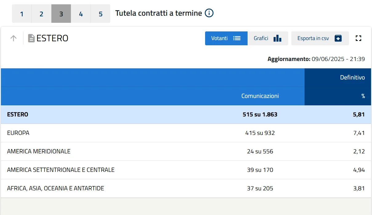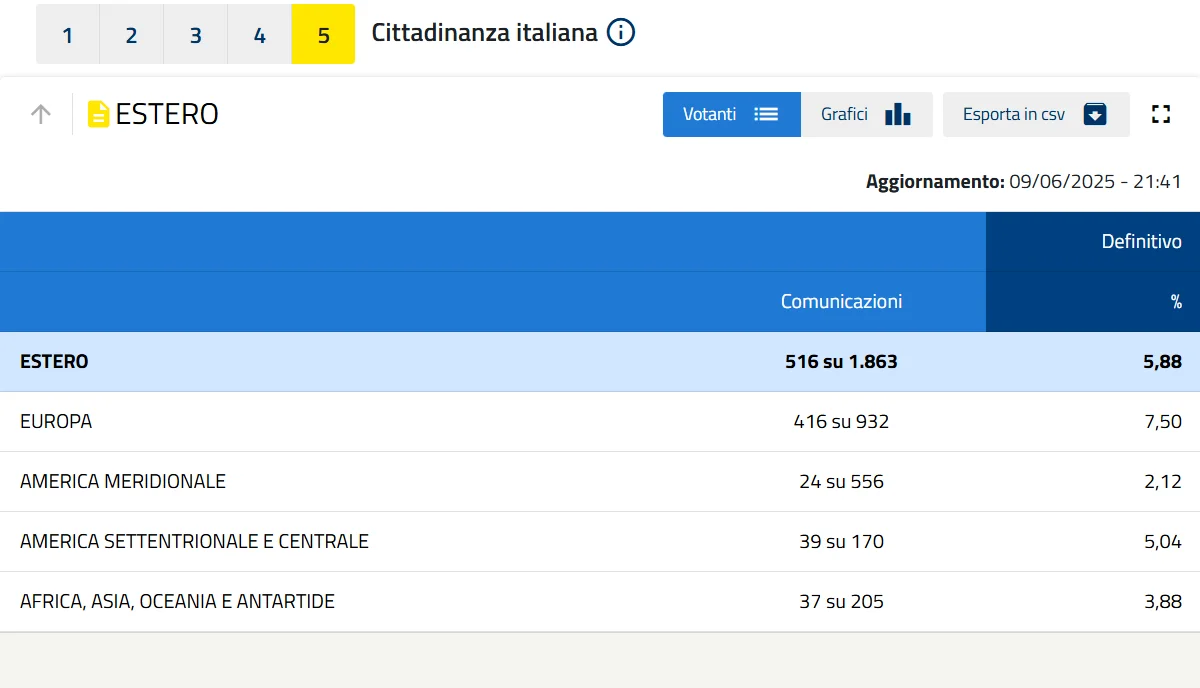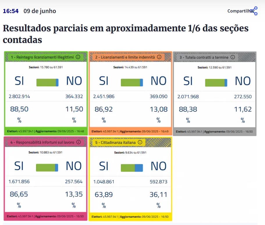 Fonte oficial: elezioni.interno.gov.it – Resultados e participação no Referendo Abrogativo 2025 (Ministério do Interior da Itália).