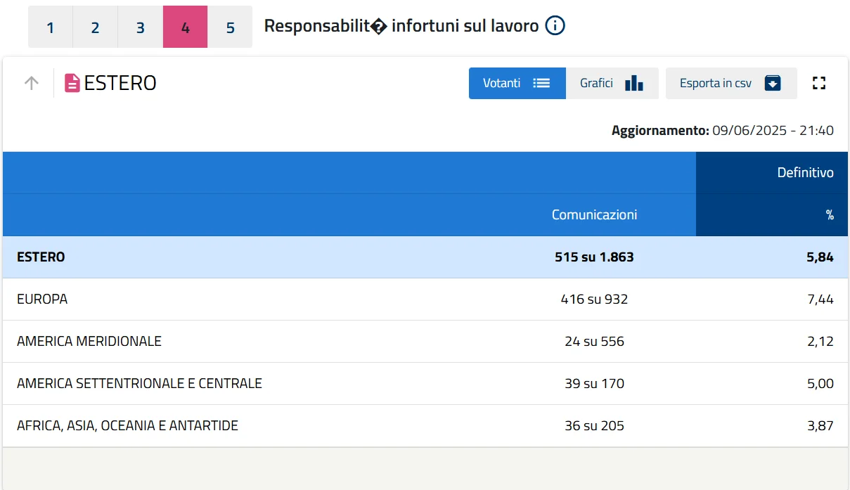 O site elezioni.interno.gov.it é a fonte oficial do Ministério do Interior da Itália para os resultados eleitorais — incluindo a participação e apuração dos referendos. Participação total (Itália + exterior) – Dados parciais até 9 de junho
