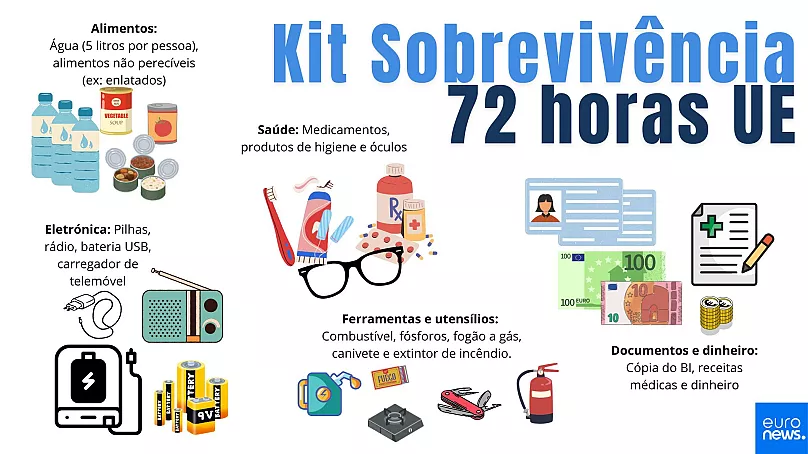 A recomendação da UE sugere que o kit de emergência inclua itens essenciais para garantir a sobrevivência básica e a saúde durante esse período.